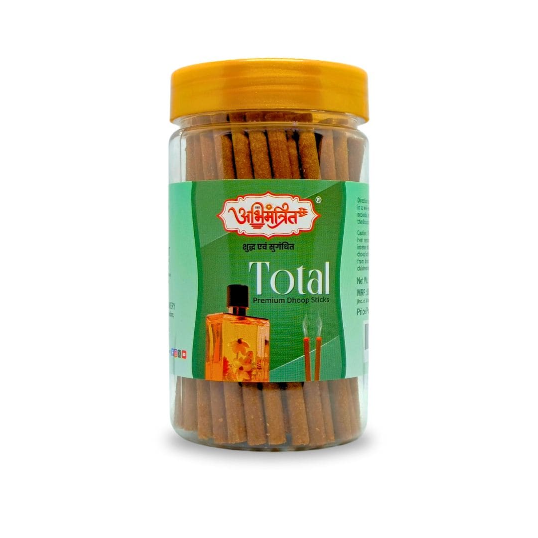 Abhimantrit Total Dhoop Sticks are designed to offer a complete and well-rounded fragrance experience for daily spiritual and home use. As the name suggests, “Total” represents a balanced blend of pleasant aromatic notes that together create a harmonious and refreshing ambience. These dhoop sticks are suitable for those who prefer a fragrance that is neither too mild nor too intense, making them ideal for regular use throughout the day.